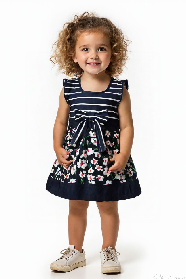 The top of the dress is decorated with charming butterfly sleeves and navy blue fabric with delicate white stripes, which emphasise the nautical style. Navy blue piping finishes add elegance and attention to detail. A beautiful bow at the waist adds girlish sweetness and catches the eye.