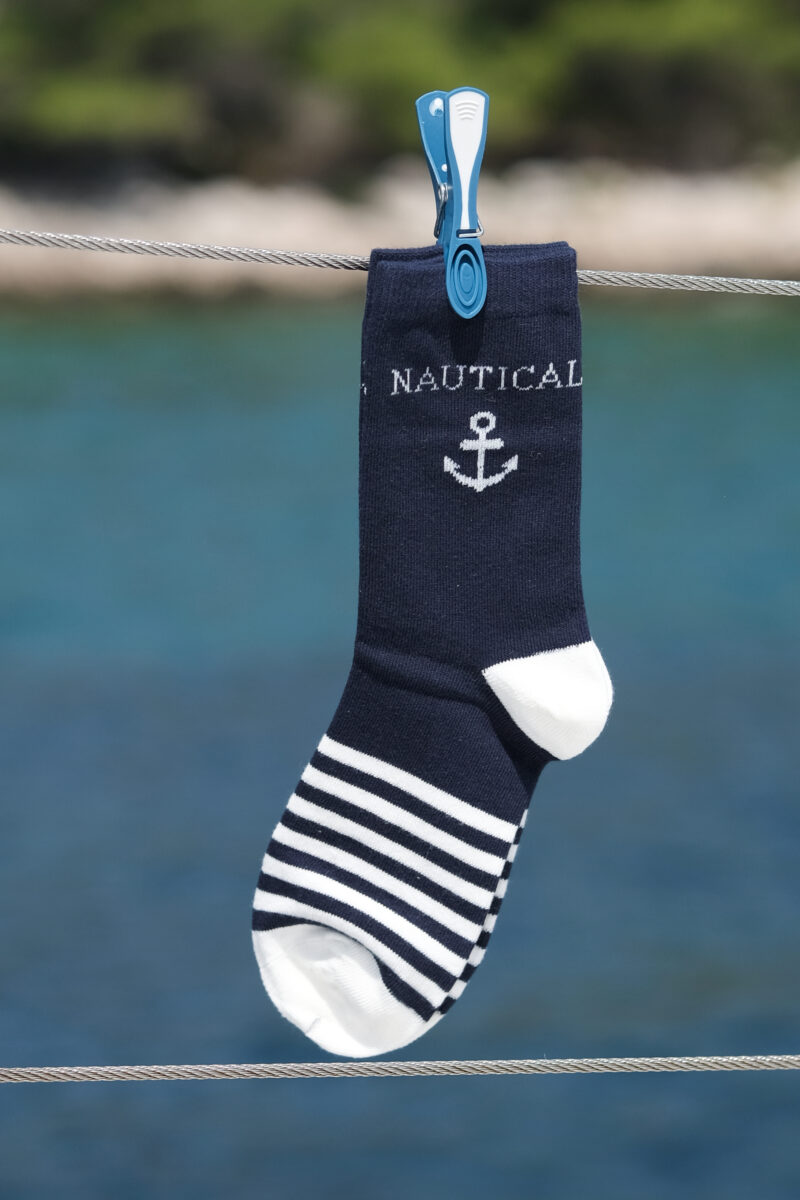 Czasem to właśnie najmniejsze elementy decydują o końcowym efekcie. Skarpetki w paski, granatowo-białe zestawienia lub delikatne wzory kotwic to uroczy sposób, by wpleść morski klimat nawet w najprostszy look.
