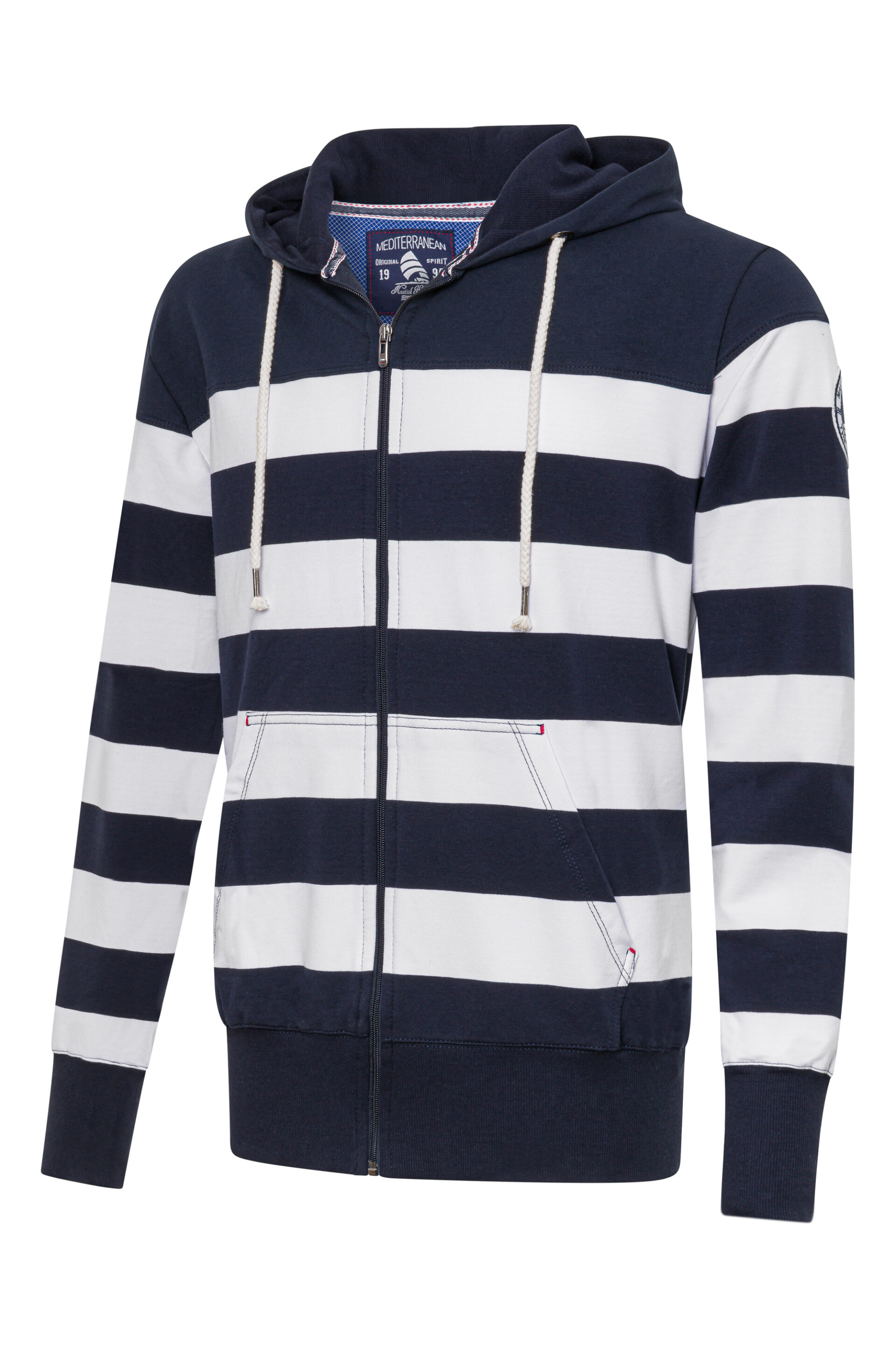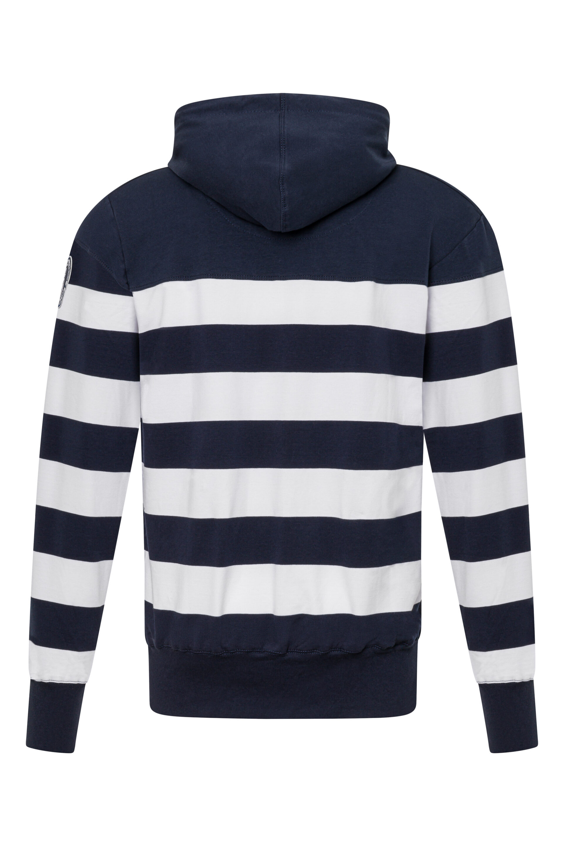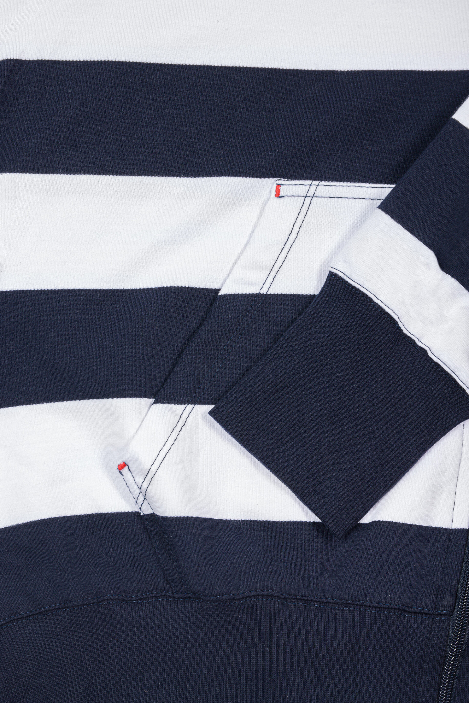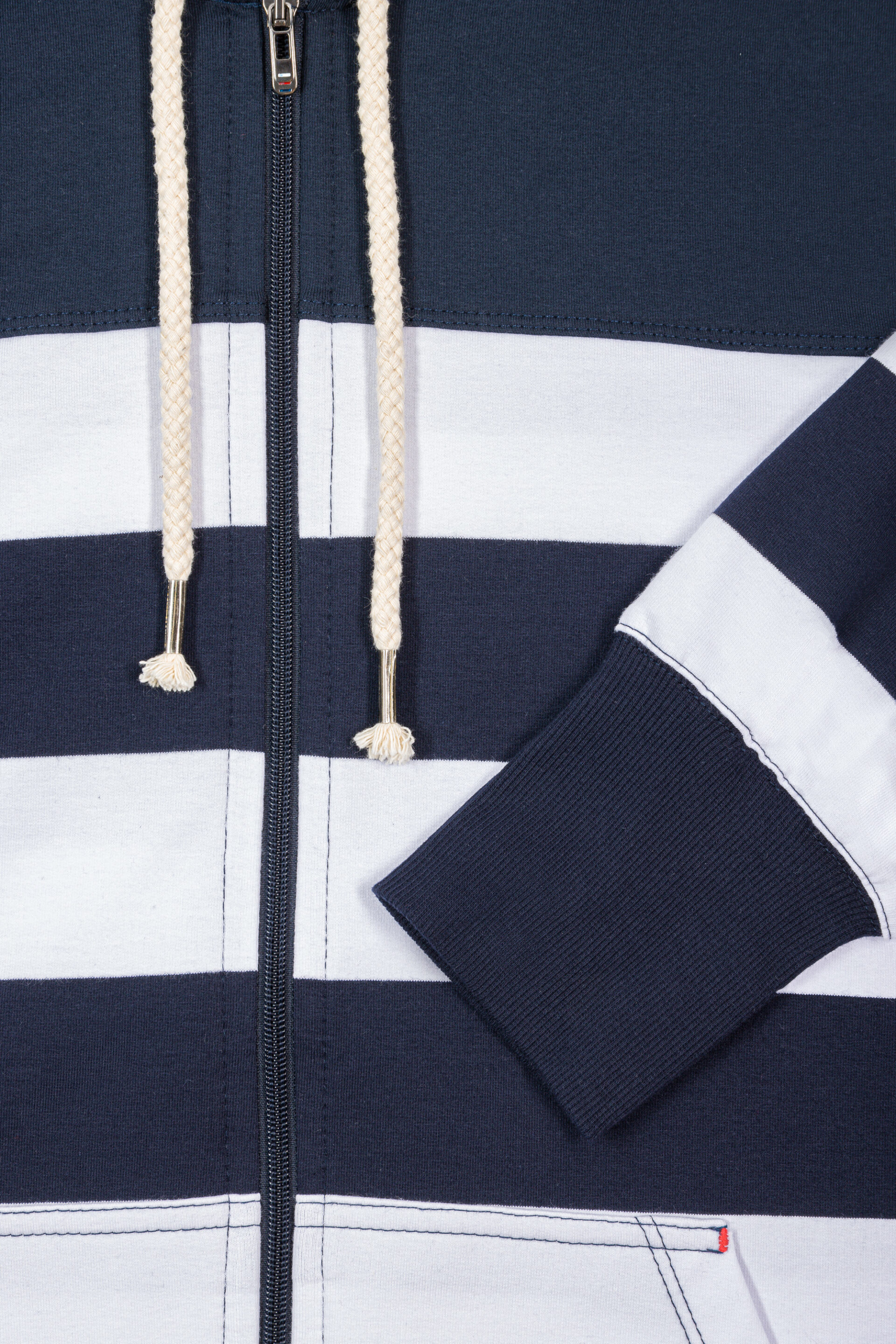 Bluza utrzymana jest w ponadczasowym połączeniu bieli i granatu, które od razu przywodzi na myśl klimat marinistyczny. Całość uzupełnia granatowy kaptur z bawełnianymi sznurkami zakończonymi metalowymi elementami z logo BLU – detal, który nadaje całości elegancji i charakteru.