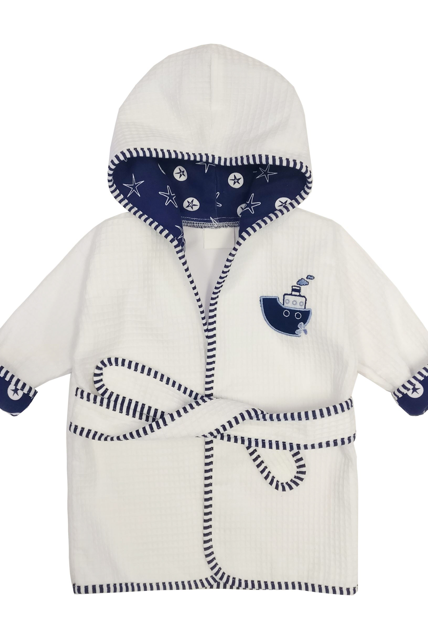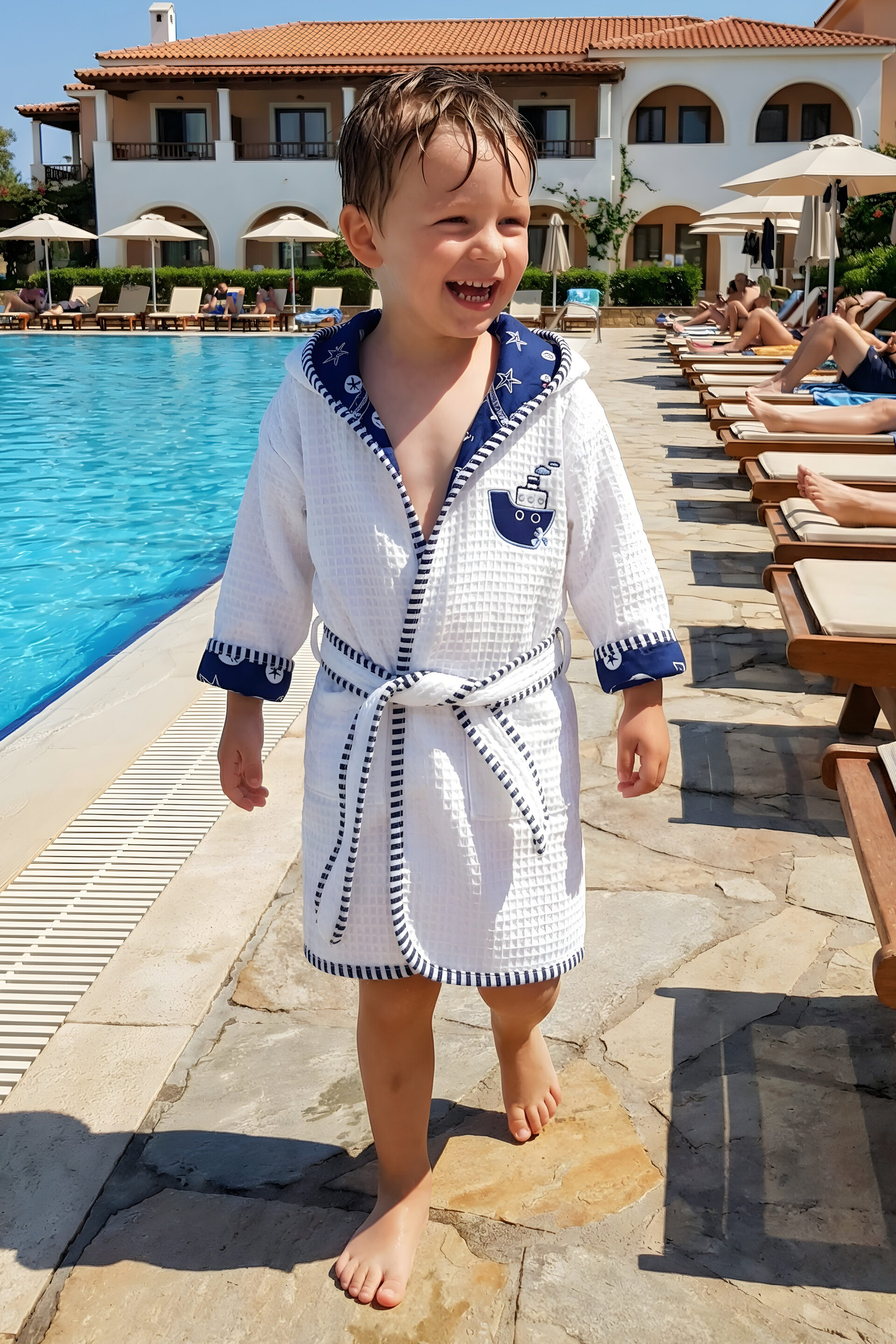 Dziecięcy szlafrok BLU to idealne okrycie po kąpieli, na basenie, nad morzem i wszędzie tam, gdzie maluch potrzebuje ciepła i komfortu. To model, który od lat jest bestsellerem w sprzedaży stacjonarnej oraz na targach — rodzice wybierają go za jakość, miękkość i niepowtarzalny marynistyczny styl BLU.